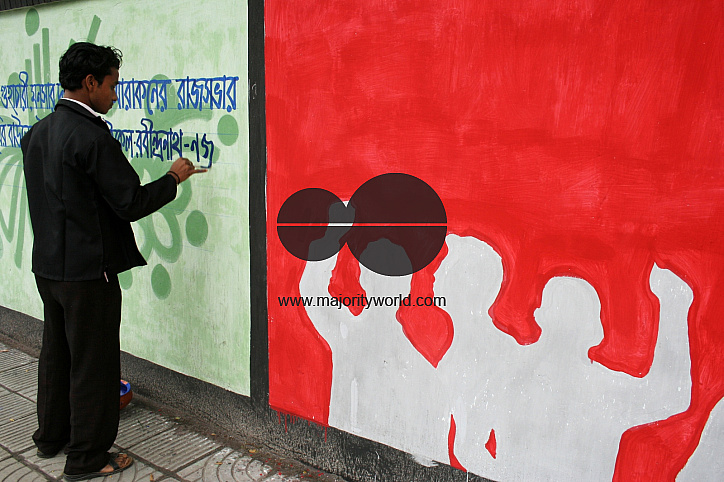 A student of Dhaka University paints the wall beside Central Shaheed Minar, language movement martyrs’ monument, ahead of Shaheed Dibosh and International Mother Language Day on 21st February. Dhaka, Bangladesh. February19, 2008.