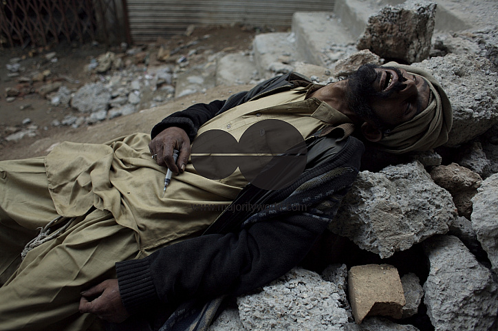 Drug addiction is one of the many human development problems hurting the poor and vulnerable the most in Pakistan. Having Afghanistan, the worlds largest poppy producing nation, as its neighbor, Pakistan serves as one of the major smuggling route for most of it. While in transit to other countries across the world, a huge quantity is spilled over within Pakistan itself. Consequently the domestic consumption of heroine has increased dramatically in Pakistan. It is estimated that about 50 tons of opium is smuggled into Pakistan for processing and domestic use alone. An addict lies unconscious on a footpath after injecting himself with heroine, in the city of Rawalpindi, in Pakistan. March 27, 2007.