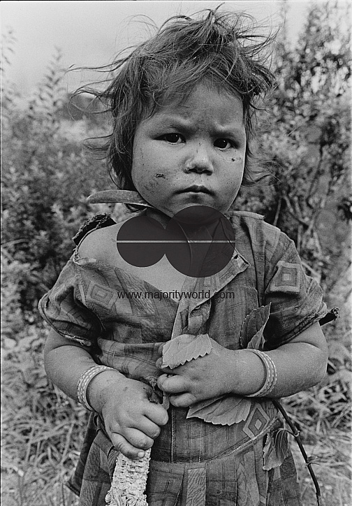 Malo, 5 years old, holds a sharp grass cutting tool in her hand. She works in fields about 2 kilometer away with her seven year old sister Masino. She belongs to Tamang tribe, a low cast in Nepal. Her sister Masino said: "We don't go to school. We have no